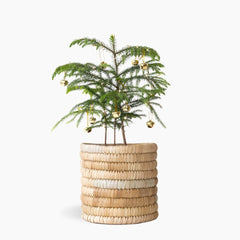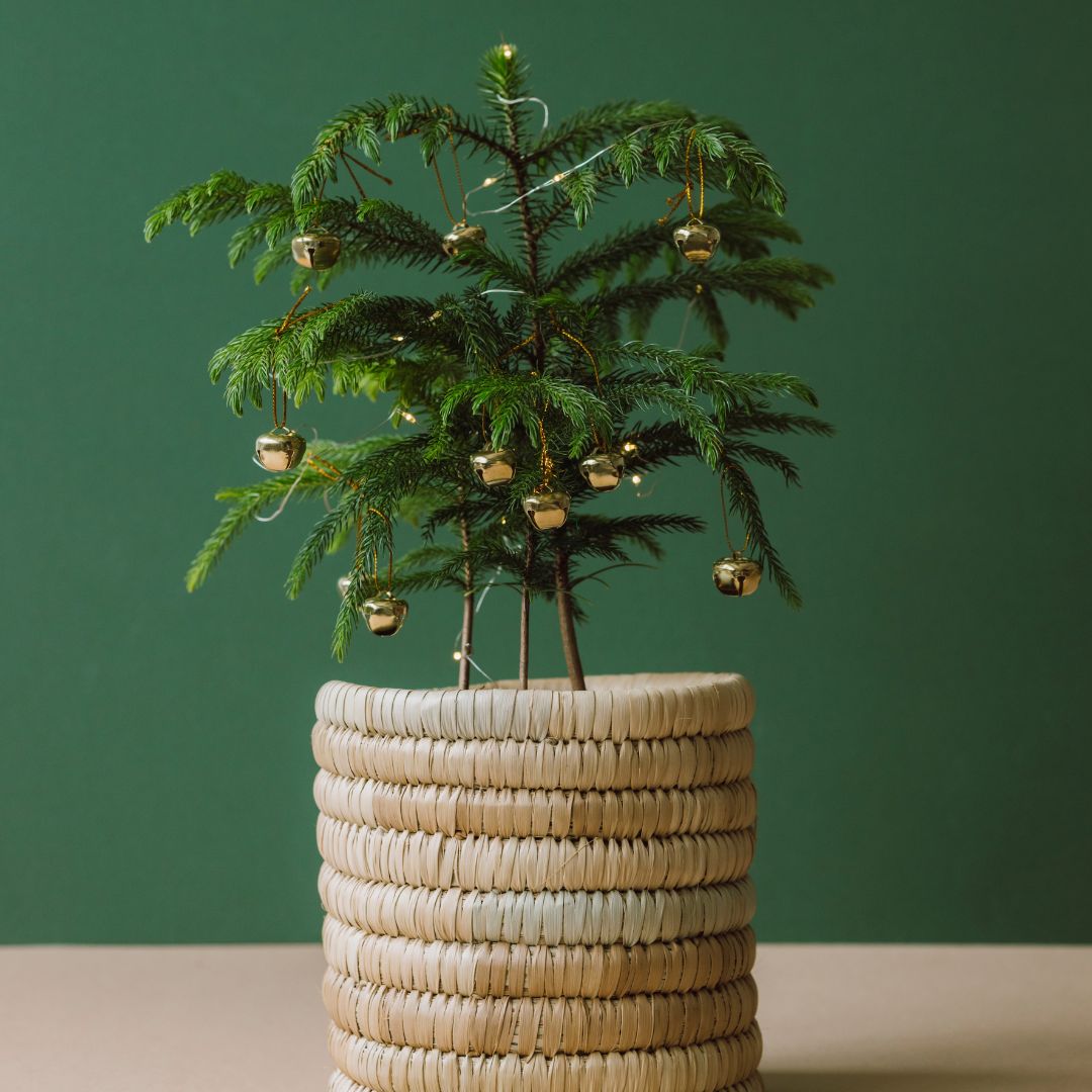 Send a little bit of Christmas magic. This real miniature evergreen pine tree brings the spirit of the season to any space β perfect for gifting, decorating a desk, or adding a festive touch to your home. It arrives in a handwoven basket planter by the Tatenda Woven Baskets team, complete with a string of tiny LED lights and golden bell baubles, ready to decorate, jingle and sparkle.