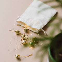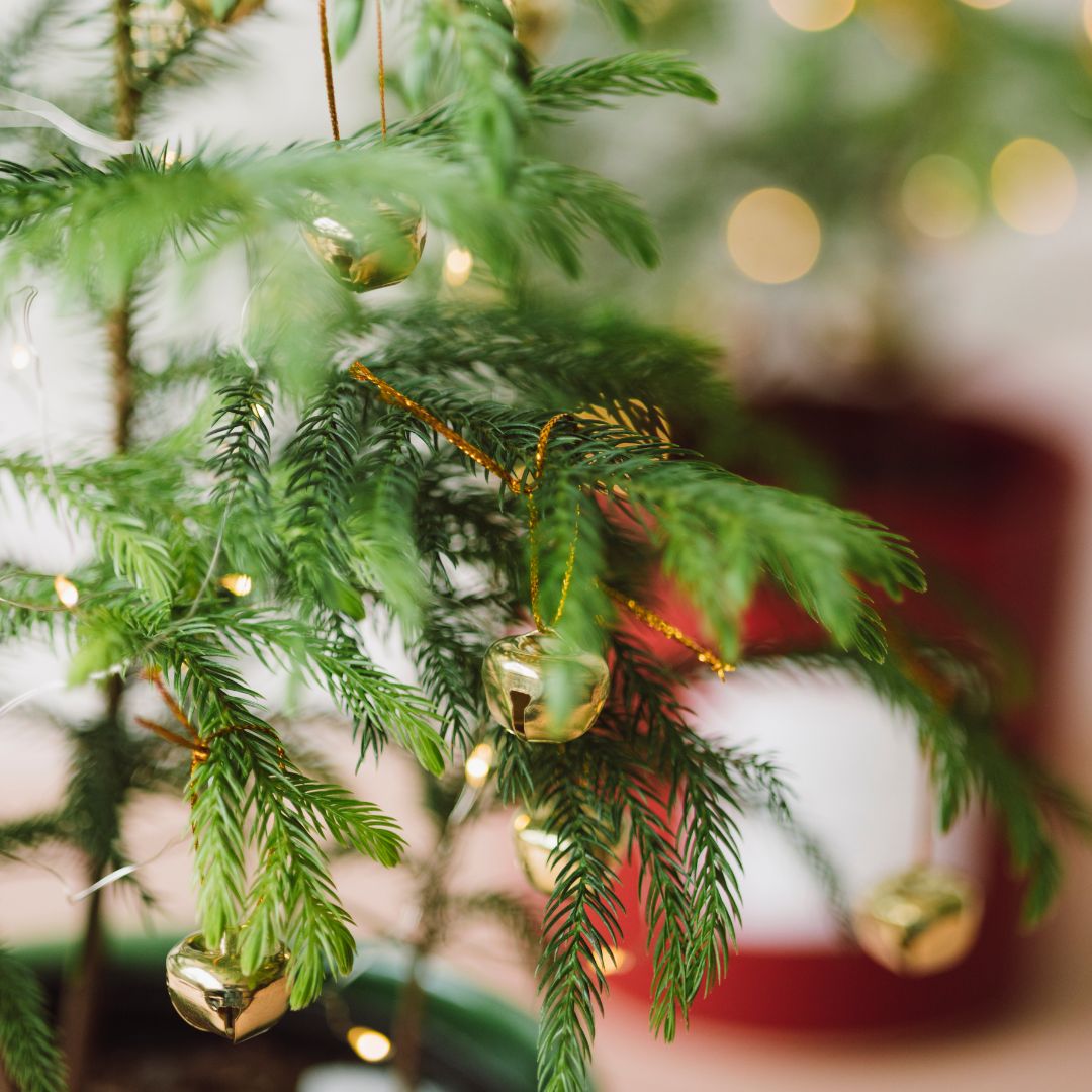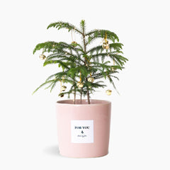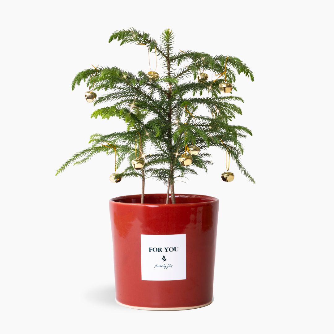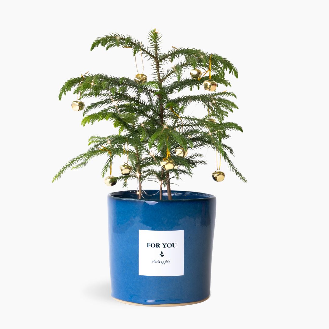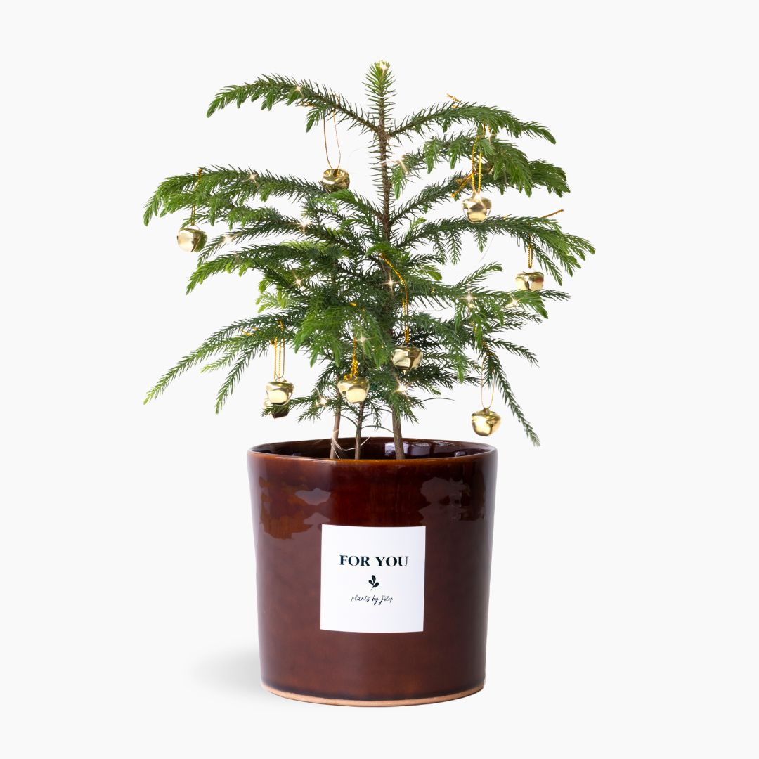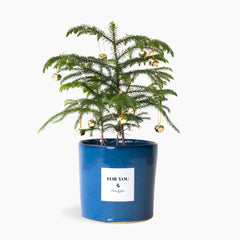 Send a little bit of Christmas magic. This real miniature evergreen pine tree brings the spirit of the season to any space — perfect for gifting, decorating a desk, or adding a festive touch to your home. It arrives in a handmade ceramic pot by the Mervyn Gers ceramics team, complete with a string of tiny LED lights and golden bell baubles, ready to decorate, jingle and sparkle.